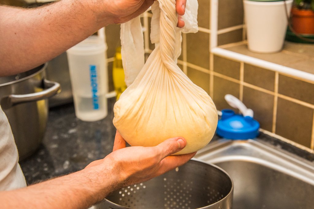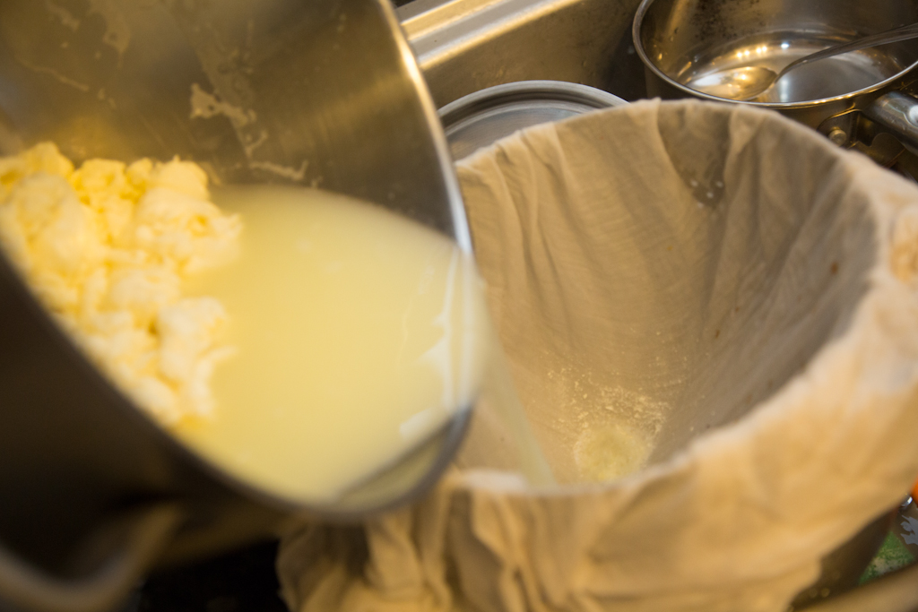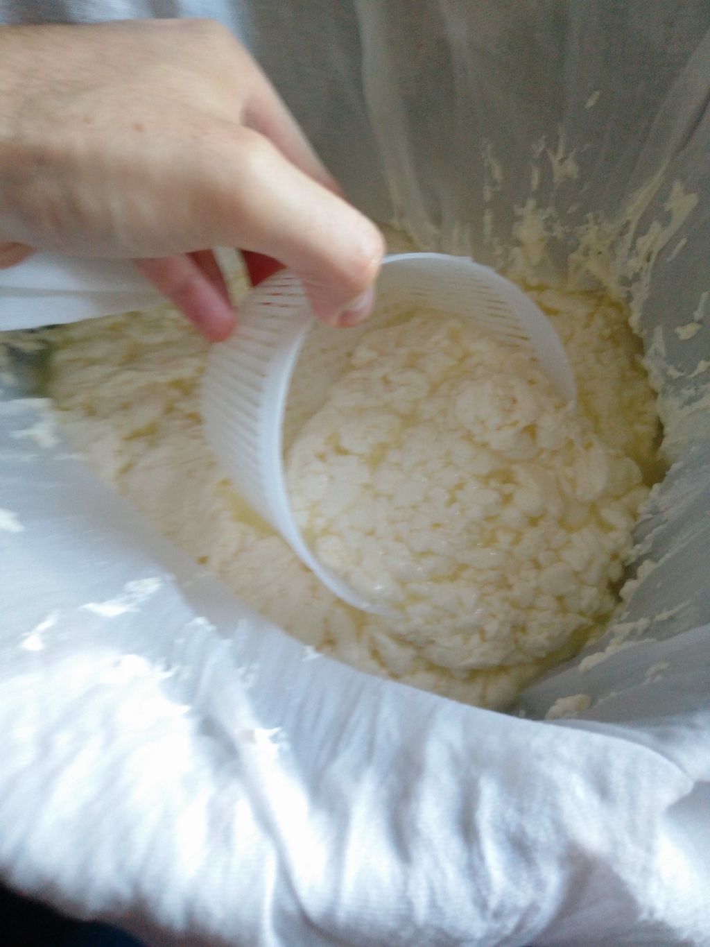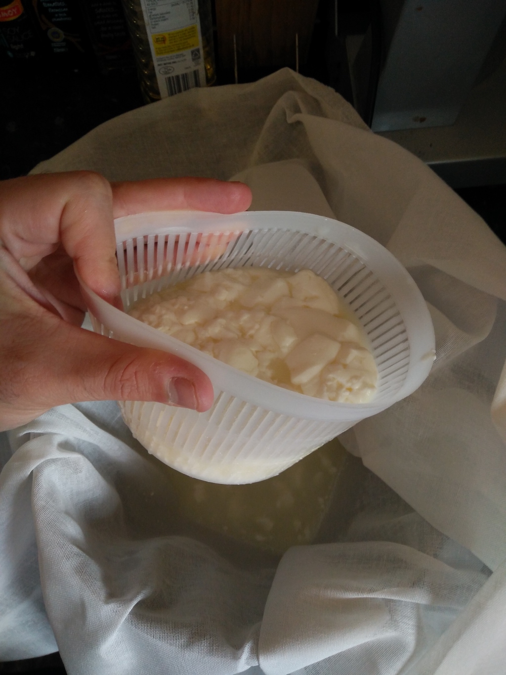 - First of all, put a cheese cloth on a colander and drain the whey in a rough way. In future, you will learn to keep the whey to be used in other cheese recipes (for example, one of my favourite, Mozzarella, is made with acidic whey).