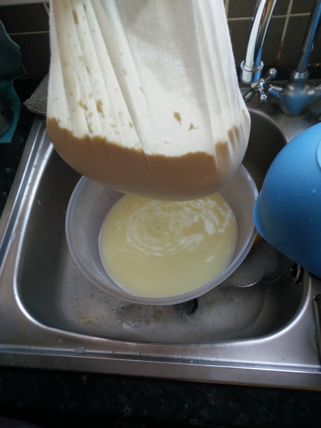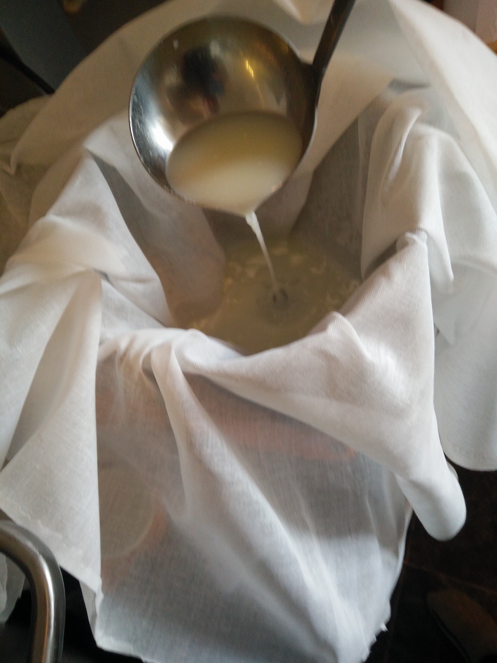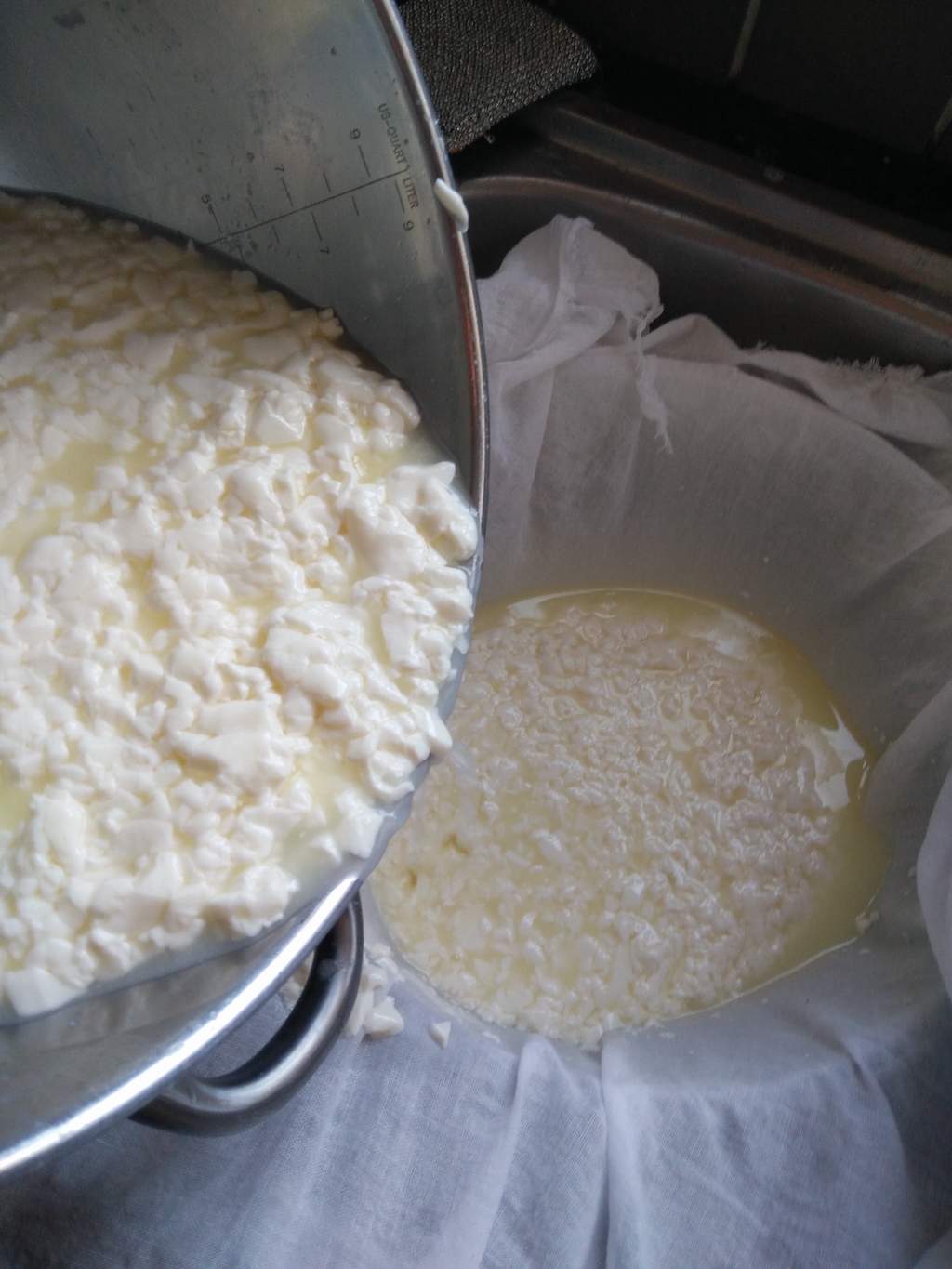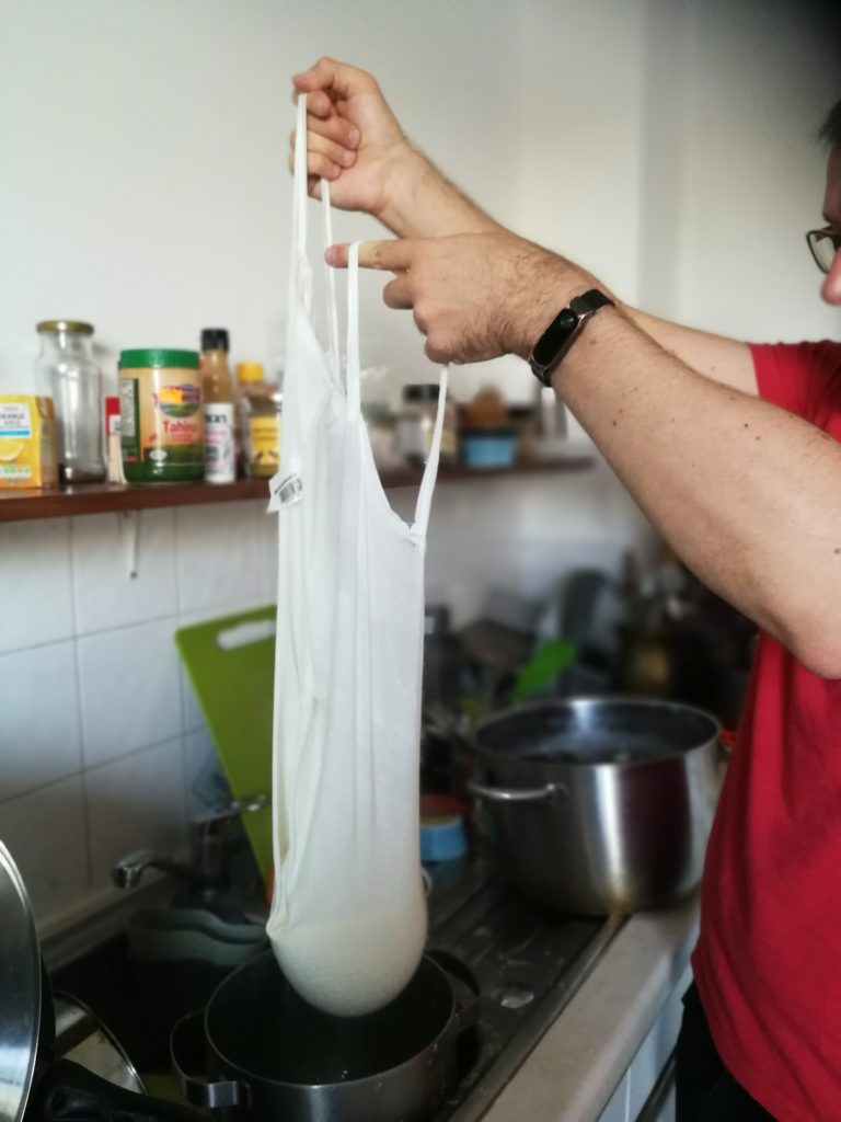 - First of all, put a cheese cloth on a colander and drain the whey in a rough way. In future, you will learn to keep the whey to be used in other cheese recipes (for example, one of my favourite, Mozzarella, is made with acidic whey).