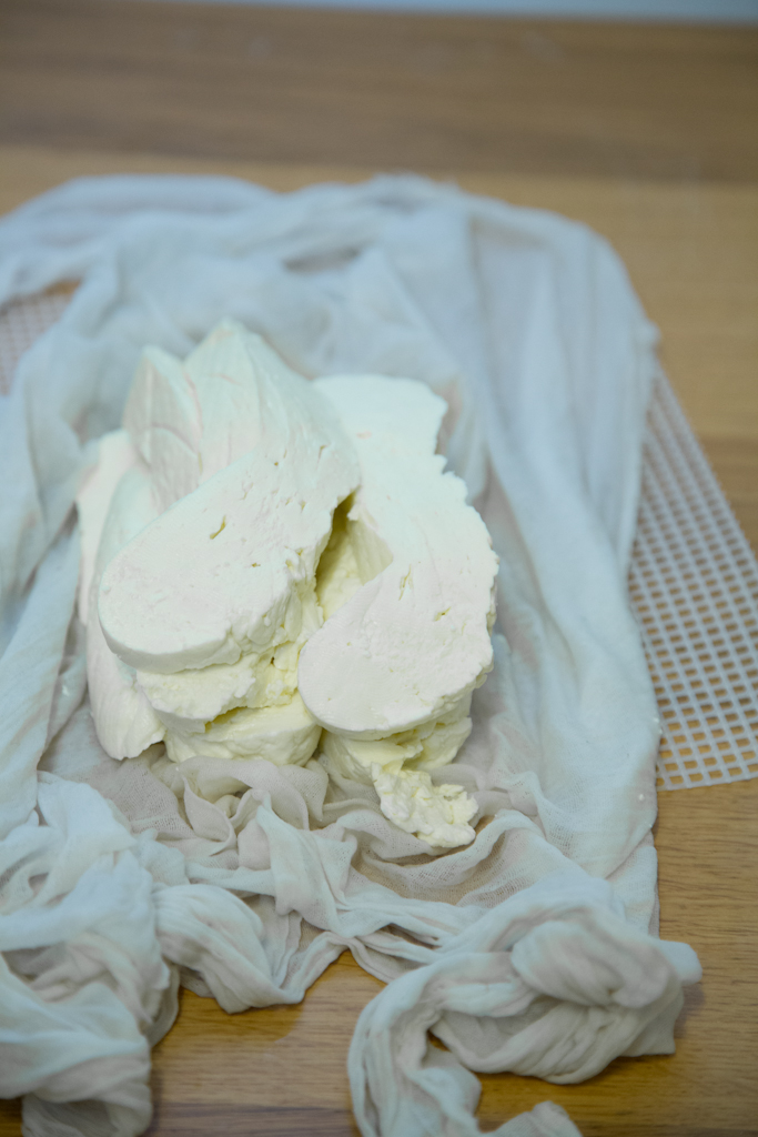 - When water is no longer dripping, you are ready to get the curds out. You will notice they will have become a single mass. Cut this mass in strips. They will have the same consistency of halloumi. Stack them and leave them for 30 minutes to lose some more water. After 30 minutes, do it again by restacking in a different order.