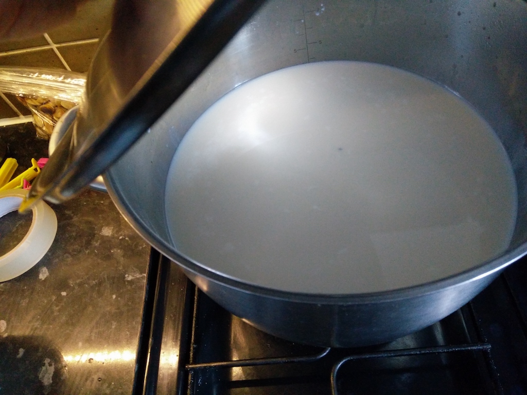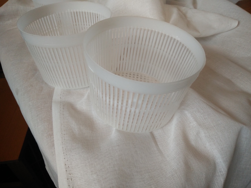 This time I will follow one procedure to get two cheeses: one ready and fresh, one to be matured. This post in two parts will show the general preparation required for these two cheeses; I will focus first on the one to be matured, and I’ll explain what to do with the fresh cheese in the next post.